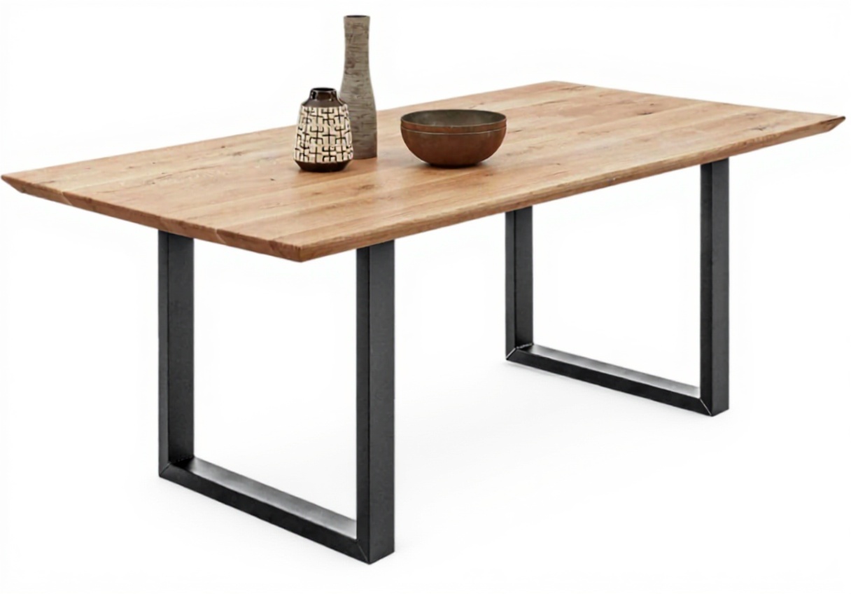 Le plateau en chêne massif, avec son épaisseur de 40 mm et son bord suisse, offre une surface généreuse et tactile, où les veines du bois racontent une histoire de durabilité. La structure à patins noirs, en métal mat, assure une stabilité silencieuse et contemporaine. On remarque la finition brute qui préserve l’authenticité du matériau, créant un contraste subtil entre la chaleur du bois et la froideur élégante du métal. Un détail : le double revêtement sur le plateau renforce sa résistance aux usages quotidiens, sans altérer son aspect naturel.